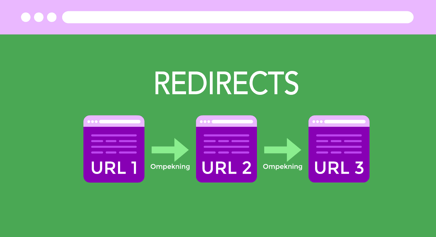 Som vi tidigare har skrivit så är redirects väldigt viktiga. Ompekningens uppgift är att överföra ett sidvärde till en annan sida på er webbplats. Det kan vara så att en utgående sida har externa länkar pekade till sig och det är just detta värde vi vill skicka vidare. En annan viktig sak ompekningen löser är att användaren som klickar in på länken kommer till en fungerande sida och inte en 404. Ju längre tiden går och ju fler ompekningar man har gjort så kan så kallade ”redirect chains (ompekningskedjor) skapas. Dessa kedjor kan ställa till det, dra ner på laddningstiden samt blir svår att crawla för bland annat Google.
