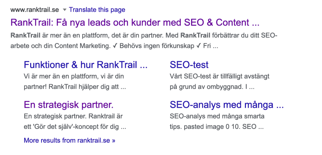 Använder du tydliga sidor som du sedan bygger ut och fyller på med innehåll kan din sida bli indexerad med såkallade sitelinks. Då tar din placering i sökresultatet en större yta och besökaren har möjlighet att navigera sig in på en undersida direkt från sökresultatet.
