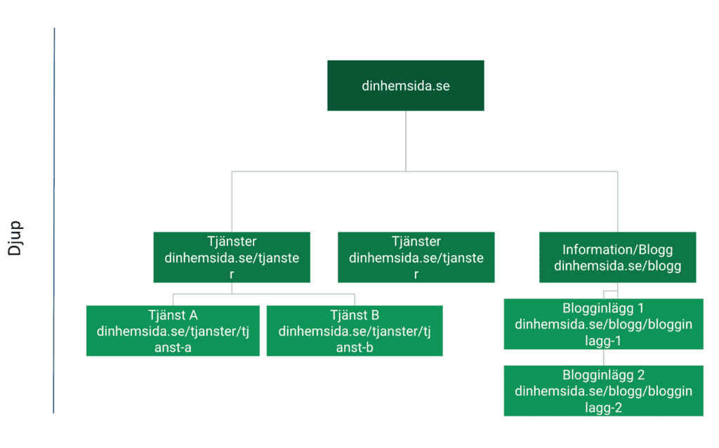 [ranktrail.se] är första våningen. [Bloggen] är andra våningen och inläggen i sin tur blir tredje våningen. Alla blogginlägg som ligger under [bloggen] ligger på tredje våningen, oavsett hur många inlägg du har.